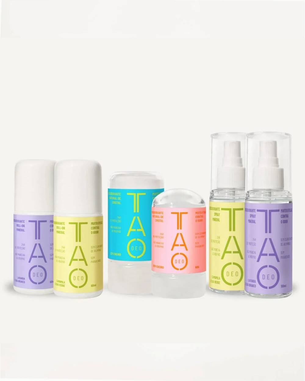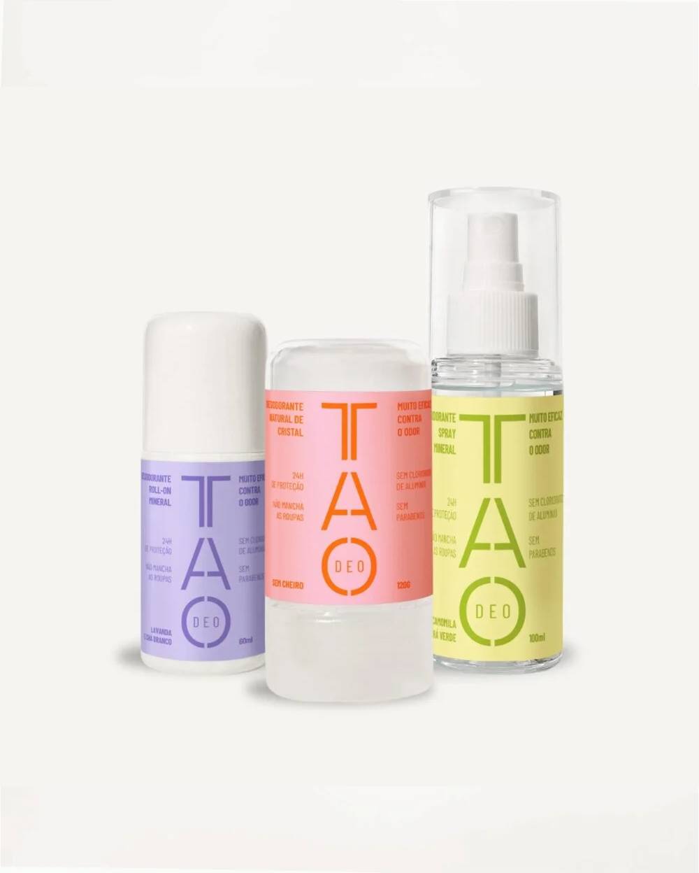 O desodorante natural de cristal é um mineral sólido que precisa ser umedecido com água antes de ser aplicado, enquanto o desodorante roll-on e spray são a forma líquida com o mesmo princípio ativo. Todos eles são naturais e livres de químicos e cloridrato de alumínio.